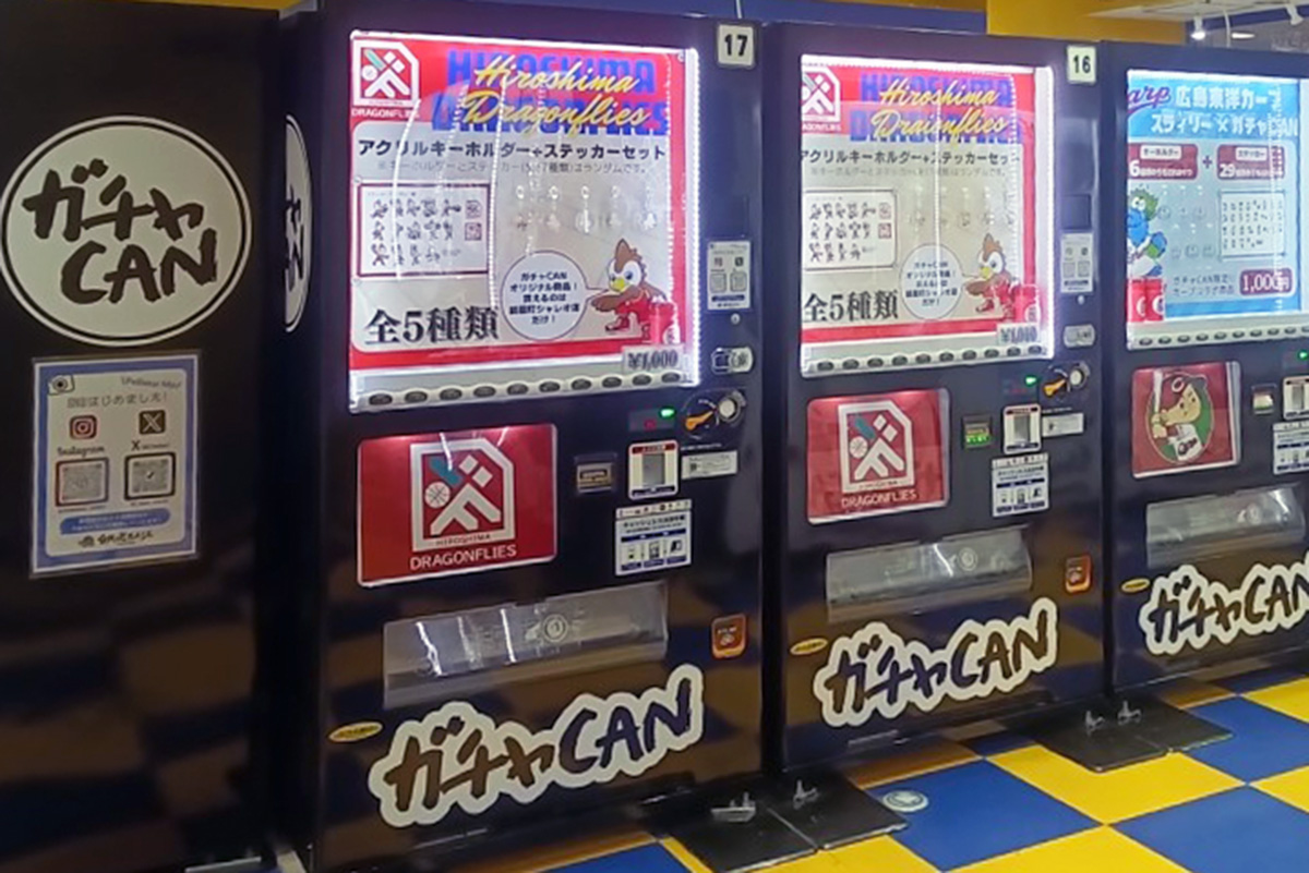 広島を拠点としたバスケットボールチーム「ドラゴンフライズ」のガチャCANオリジナル商品です。自販機BASEシャレオはスタジアムにも近く、観戦前や後にお立ち寄りください。